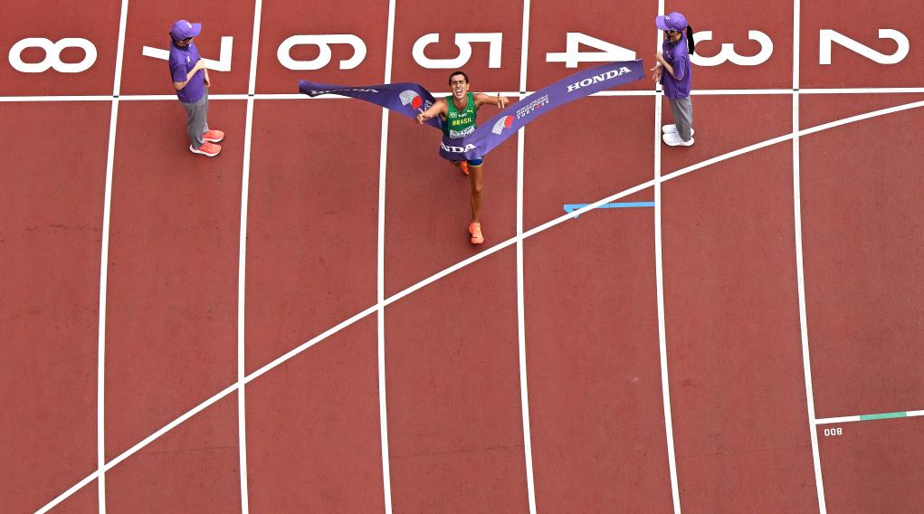 2025年9月20日,巴西选手邦芬冲过终点。最终,他获得冠军。当日,2025年世界田径锦标赛竞走男子20公里决赛在日本东京举行。新华社记者 李明 摄