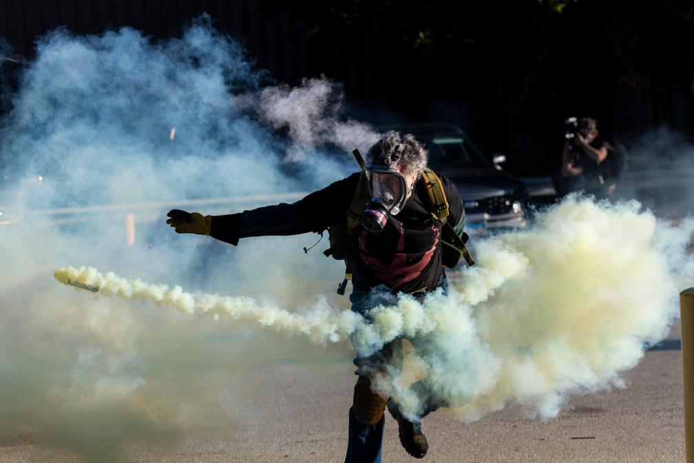 2025年9月26日,在位于美国芝加哥西郊布罗德维尤市的移民与海关执法局办事机构外,抗议者在冲突中将执法人员发射的催泪弹瓶扔回。特朗普2025年1月重返白宫以来,授命移民与海关执法局在美国各地实施搜捕、拘押和遣返非法移民的行动,在多个民主党主政地区引发示威和骚乱,移民安置场所频繁成为执法人员与抗议者的冲突现场。新华社发(文森特·约翰逊 摄)