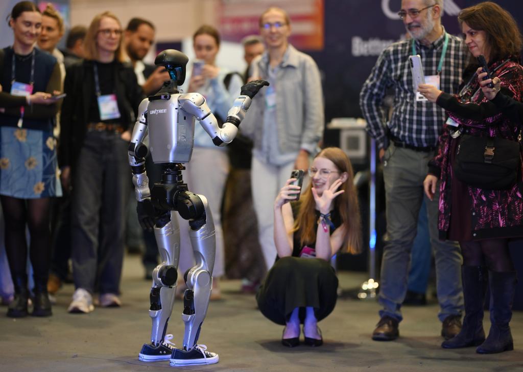 2025年11月12日,在葡萄牙里斯本,中国企业宇树科技的人形机器人和与会者在2025年网络峰会现场互动。2025年网络峰会于11月10日至13日在葡萄牙里斯本举办,吸引了2500多家初创企业和逾千名投资者。新华社发