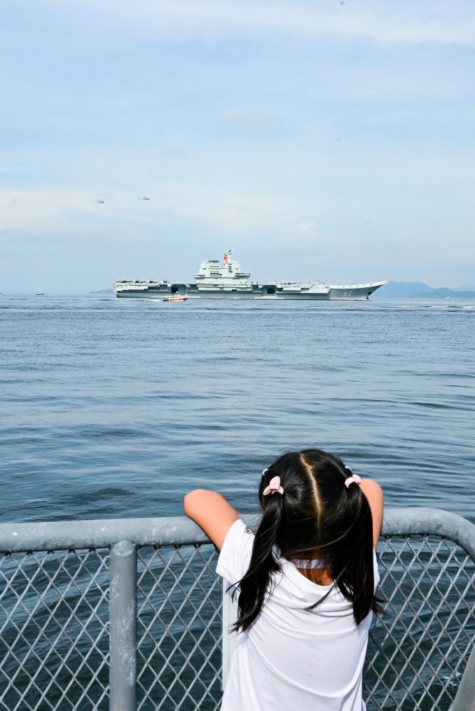 2025年7月3日,一名儿童在岸上观看海军山东舰抵达香港。新华社记者 朱炜 摄