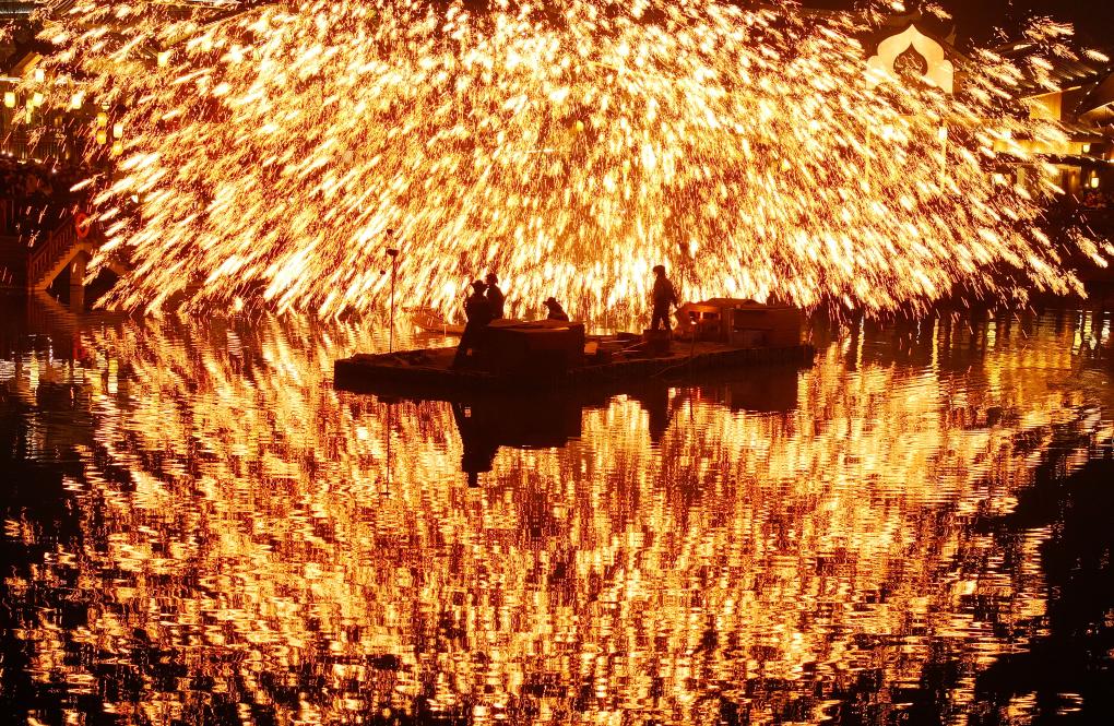2025年1月29日,在湖南省衡阳市南岳区“南岳里”庙会民俗美食街区,民间艺人在为游客表演非遗打铁花。春节假期,各地群众欢欢喜喜过大年。新华社发(曹正平 摄)