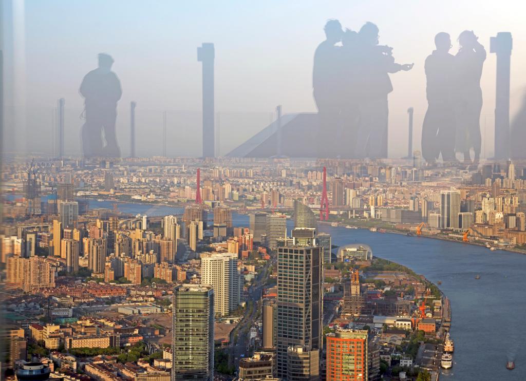 2025年4月14日,人们的身影映在位于上海白玉兰广场顶层的白玉兰观景台玻璃上。新华社记者 刘颖 摄