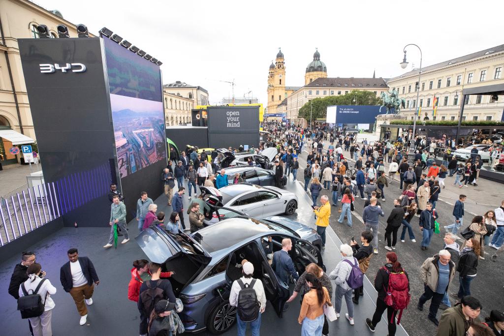 2025年9月9日,人们在德国慕尼黑国际车展户外展区的比亚迪展台参观。2025年德国国际汽车及智慧出行博览会(慕尼黑国际车展)于9月9日至14日在慕尼黑举行,110多家中国企业参展。新华社记者 张帆 摄