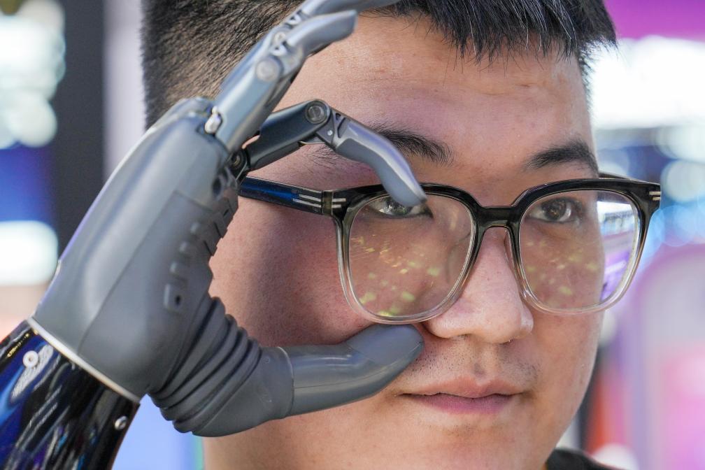 2025年7月17日,在第三届中国国际供应链促进博览会数字科技链展区,浙江强脑科技有限公司一名右手残疾的工作人员在佩戴了BrainCo智能仿生手后摘取眼镜。新华社记者 鞠焕宗 摄