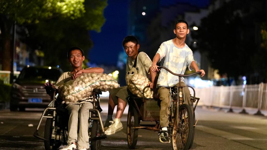 2025年8月6日清晨,三名小伙在出摊卖大蒜的路上。在江西省上饶市信州区,三位“00后”——“小龙”“小琪”“小寒”(均为化名)都是先天性脑瘫患者,平衡能力弱,走路不稳。“小龙”卖过气球,“小琪”卖过面包,“小寒”卖过瓜子,但都以失败告终。2024年9月,他们在当地残联的一场活动中相识,由于病情类似,经历相仿,三人一拍即合,决心一起合租,共同创业。新华社记者 胡晨欢 摄