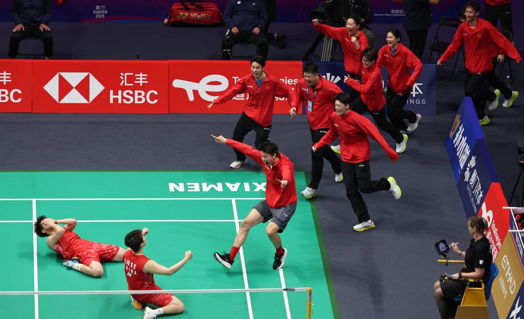 2025年5月4日,中国队夺冠后庆祝。当日,在福建厦门举行的2025年苏迪曼杯世界羽毛球混合团体锦标赛决赛中,中国队3比1战胜韩国队,夺得冠军。新华社记者 王楷焱 摄