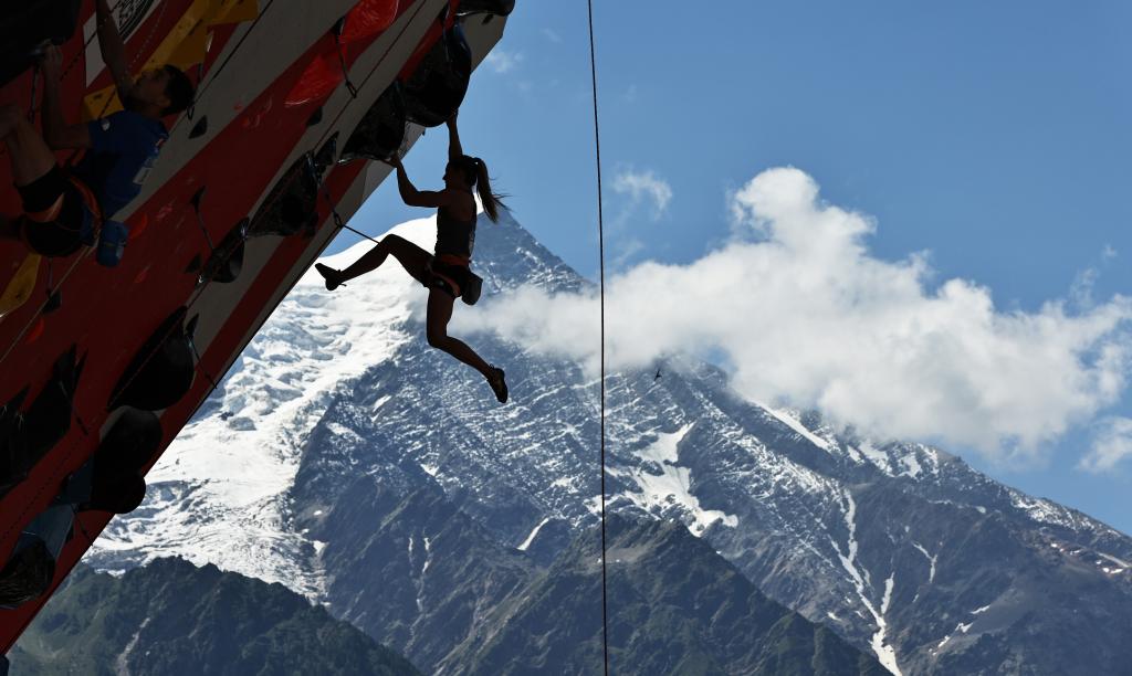 2025年7月12日,奥地利选手杰西卡·皮尔兹在比赛中。当日,2025攀岩世界杯霞慕尼站女子难度资格赛在法国霞慕尼举行。新华社记者 高静 摄