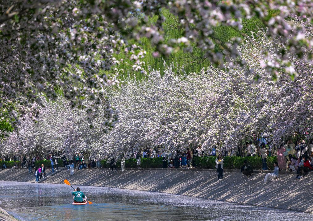 2025年4月6日,人们在北京市朝阳区望京海棠花溪畔休闲。新华社记者 胡竞文 摄