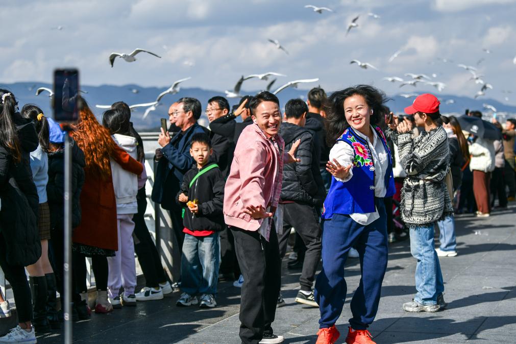 2025年1月8日,在云南省昆明市海埂大坝,游客以红嘴鸥为背景拍摄舞蹈视频。新华社记者 王静颐 摄