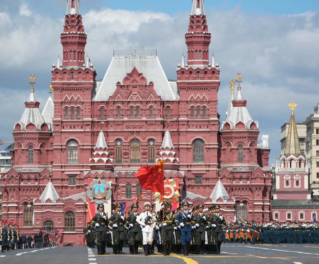 2025年5月9日,在俄罗斯首都莫斯科,中国人民解放军仪仗司礼大队方队参加纪念苏联伟大卫国战争胜利80周年阅兵式。新华社记者 赖向东 摄