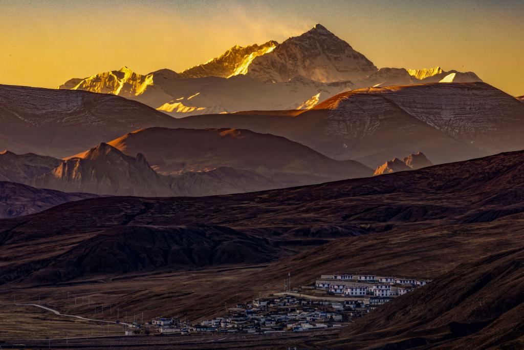 2025年11月13日日出时分拍摄的西藏自治区定日县协格尔镇查那村,村中地势较高处为建成并交付使用的新房。进入冬季,珠峰脚下西藏定日地震灾区重建的2.2万余户民房和维修加固的1.05万余户房屋已全部交付使用,群众陆续搬入新居温暖过冬。新华社记者 姜帆 摄
