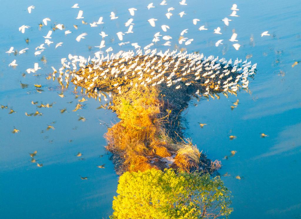 2025年12月6日,群鸟在江苏兴化里下河国家湿地公园内栖息、觅食。冬日的大地,仍展露斑斓的生机,一幅幅色彩与静谧交织的画面悄然展开。新华社发(周社根 摄)