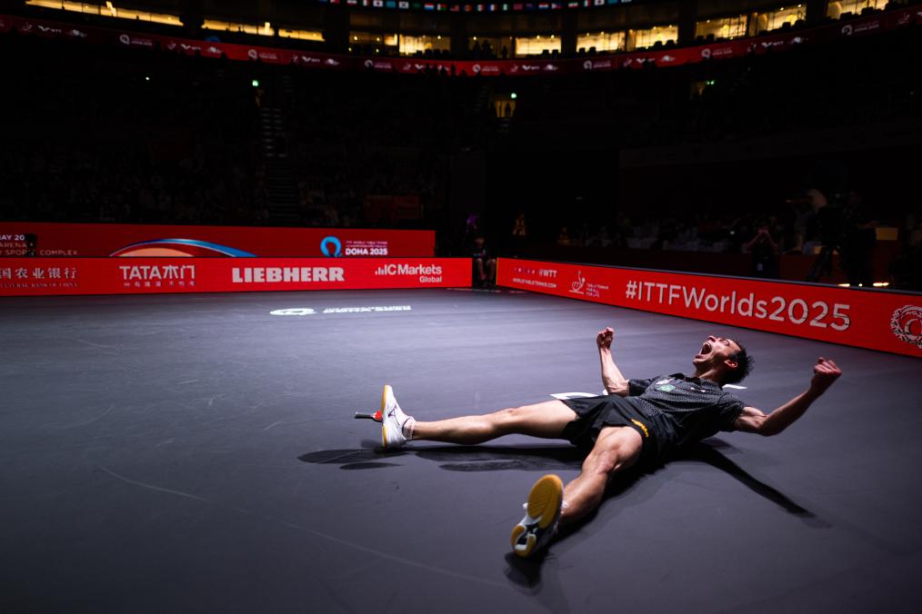 2025年5月24日,雨果·卡尔德拉诺在赛后庆祝。当日,在卡塔尔多哈举行的2025年世界乒乓球锦标赛男子单打半决赛中,巴西选手雨果·卡尔德拉诺4比3战胜中国选手梁靖崑,晋级决赛。新华社记者 肖艺九 摄