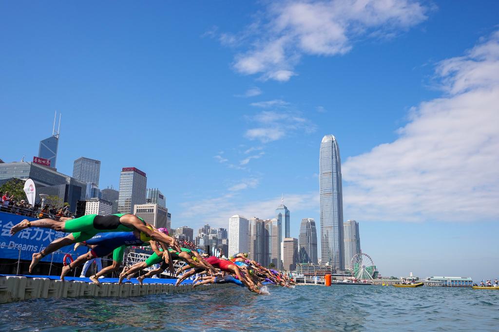 2025年11月15日,参赛选手在比赛中入水。当日,第十五届全国运动会铁人三项男子个人比赛在香港举行。新华社发(吕小炜 摄)