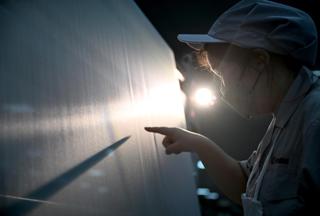 2025年3月19日,在河南光远新材料股份有限公司电子布生产车间,工人在巡台检验。新华社记者 李嘉南 摄