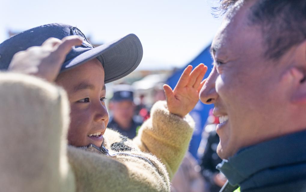 2025年1月14日,西藏自治区日喀则市定日县长所乡嘎布村的小朋友在地震救灾时戴上移民警察米玛次仁的帽子敬礼。新华社记者 丁增尼达 摄
