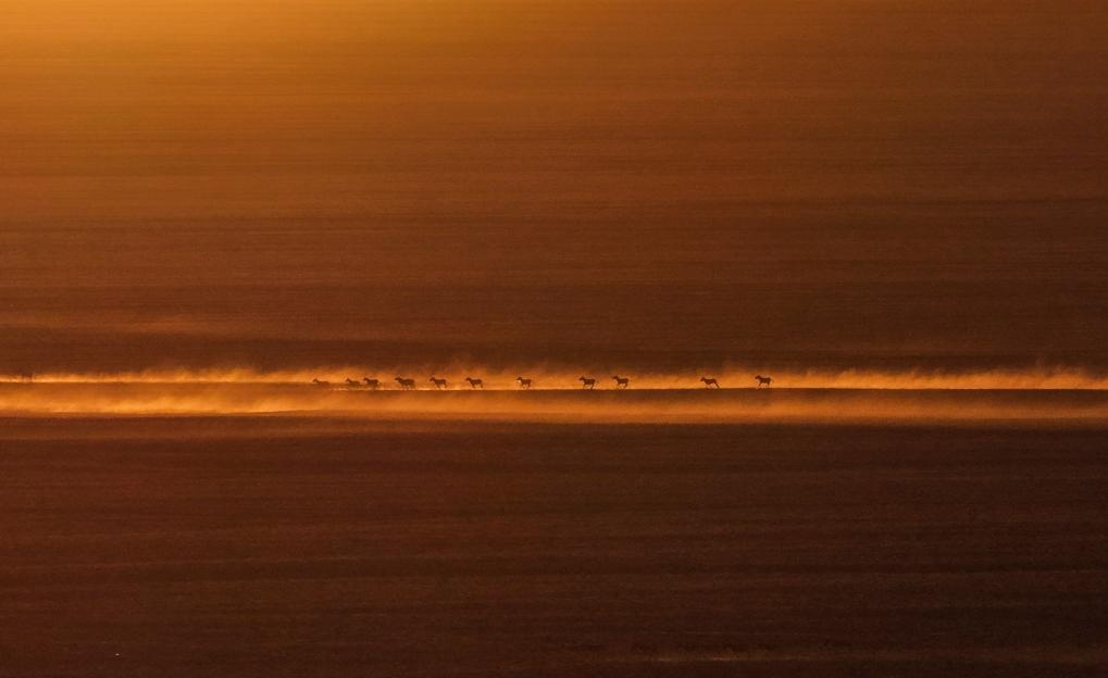 在阿尔金山国家级自然保护区,藏野驴奔跑在日出时的依协克帕提草原上(2025年12月9日摄)。阿尔金山国家级自然保护区地处昆仑山东部,面积约4.5万平方公里,平均海拔4580米。由于特殊的地理位置和地形地貌,这里常年人迹罕至,有世界净土之誉,生态系统的原始性和原真性保持完好,物种的演变和进化在这里都留下完整的痕迹。冬日的保护区虽极寒缺氧,空气稀薄,却自由栖息着万物生灵,数百种野生动物在此生活栖息、繁衍壮大,在阿尔金山国家级自然保护区,生命的赞歌在壮美的天地之间婉转悠扬。新华社记者 辛悦卫 摄