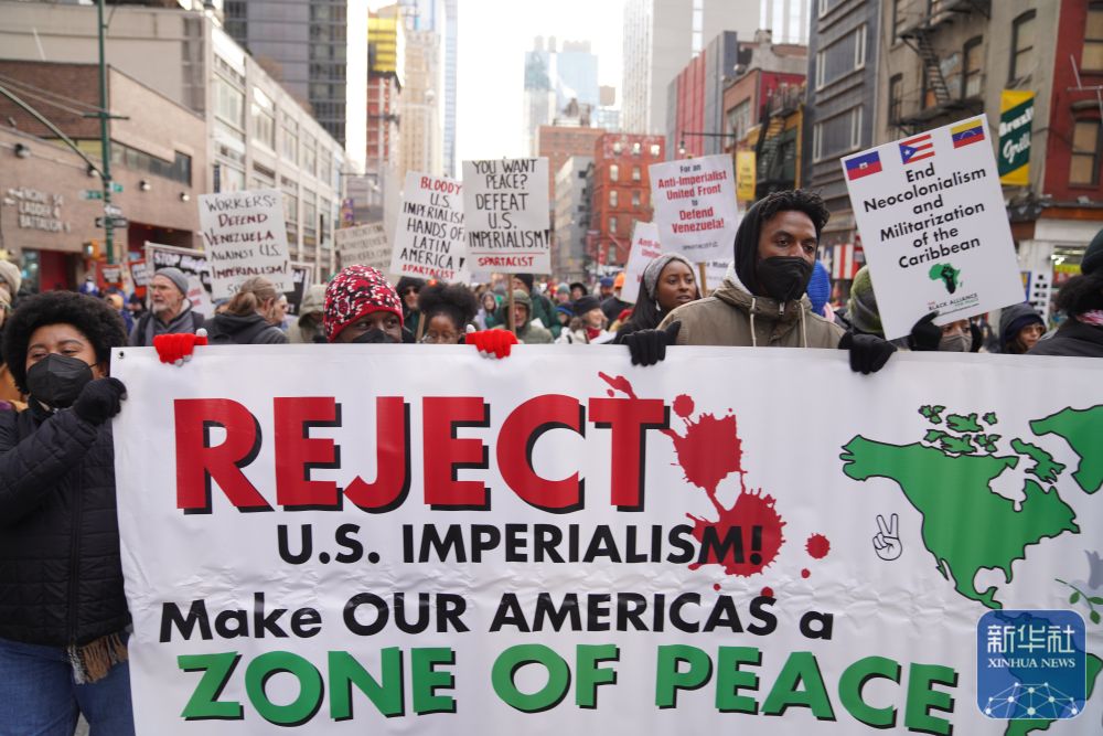 当日,近千名民众在美国纽约举行集会游行,抗议美国对委内瑞拉实施军事打击。