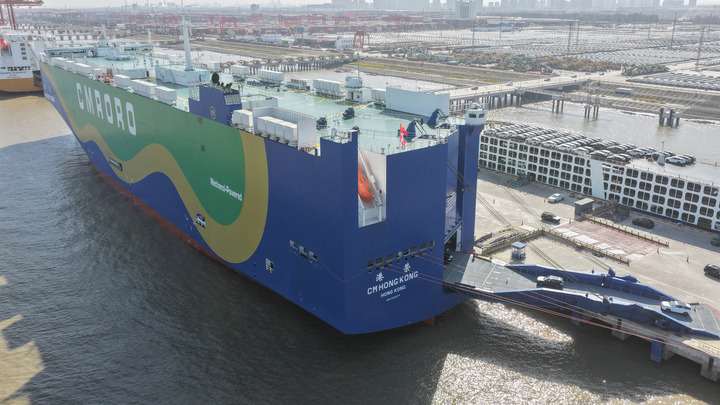 2025年12月9日,在江苏省苏州港太仓港区,“港荣”号甲醇双燃料动力滚装船在装载出口汽车(无人机照片)。新华社发(计海新摄)