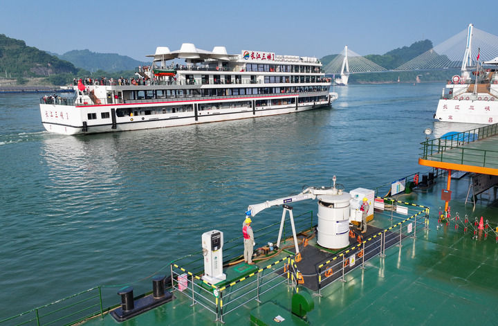 2025年10月,湖北“江陵—武穴”617公里长江航线上建设的5座电动船舶充换电站正式启用,“船电分离”让电池在港口与充换电站之间高效运转,可降低用户等待时间,提升港口物流效率。华电湖北发电有限公司分管负责人王迅说:“单个电池换电过程时间短,效率比直接充电提升20倍以上。”