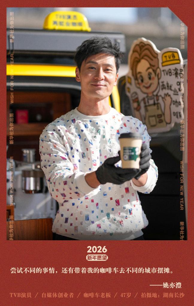 47岁的姚亦澧是来自中国香港的TVB(香港无线电视)演员,他同时还是自媒体创业者和咖啡车老板。目前在湖南长沙摆摊卖咖啡。姚亦澧的新年愿望是:希望尝试不同的事情,带着咖啡车去不同的城市摆摊。