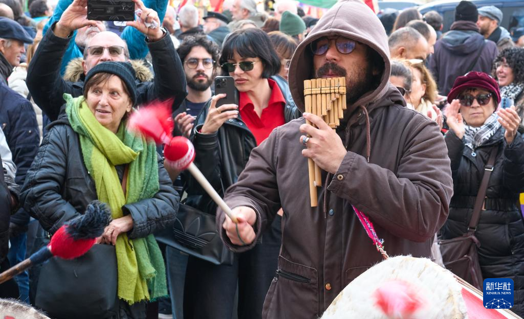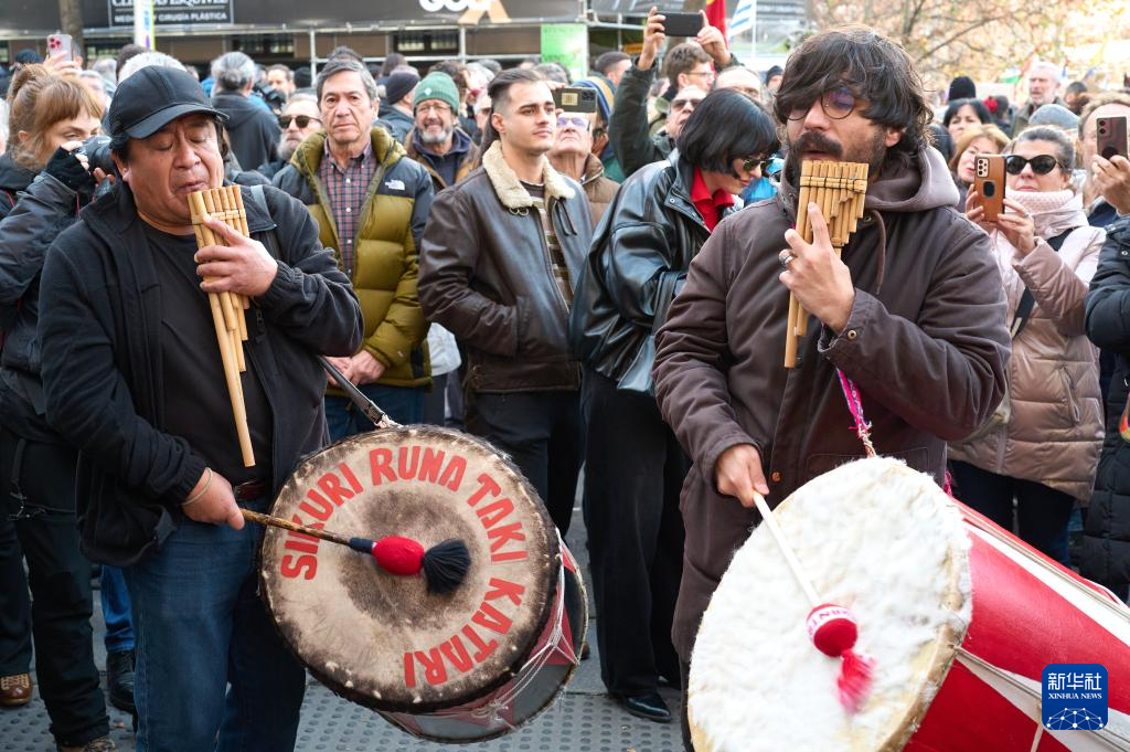 1月4日,秘鲁移民后裔、安第斯传统乐团成员阿尔贝托·卡尔德隆(右)与团员在西班牙马德里街头演奏,抗议美国强行控制委内瑞拉总统马杜罗。新华社记者 孟鼎博 摄