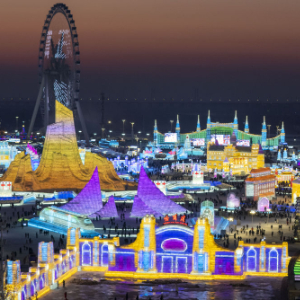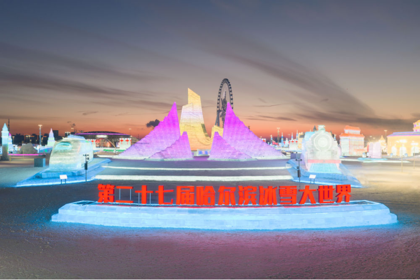 第二十七届哈尔滨冰雪大世界园区夜景。