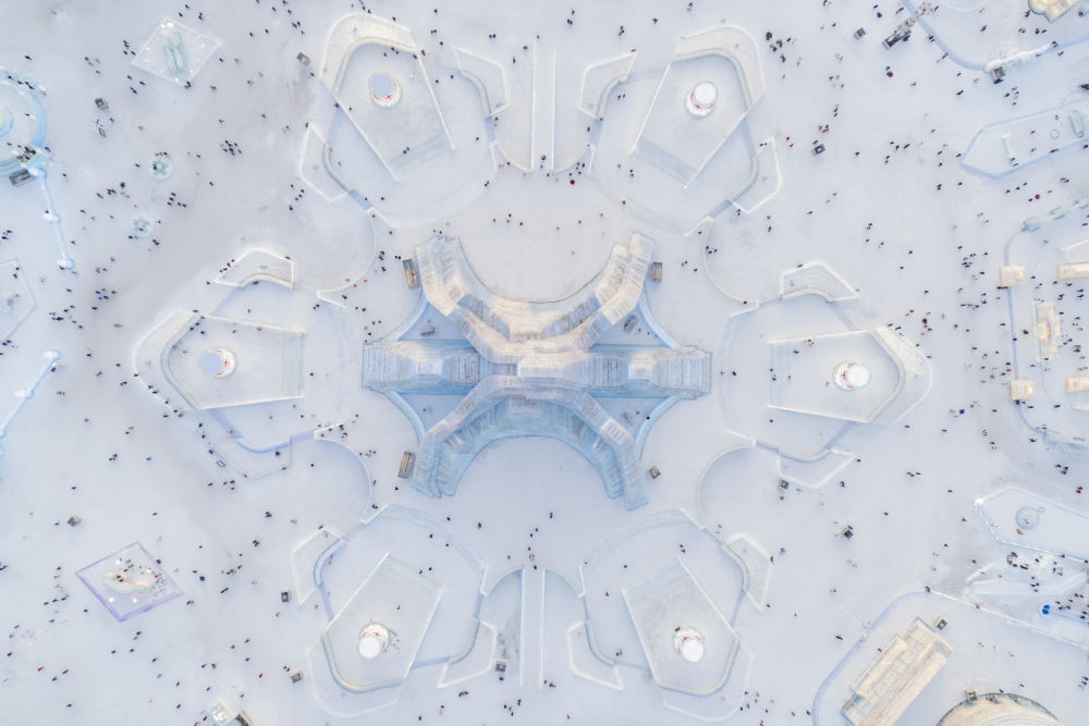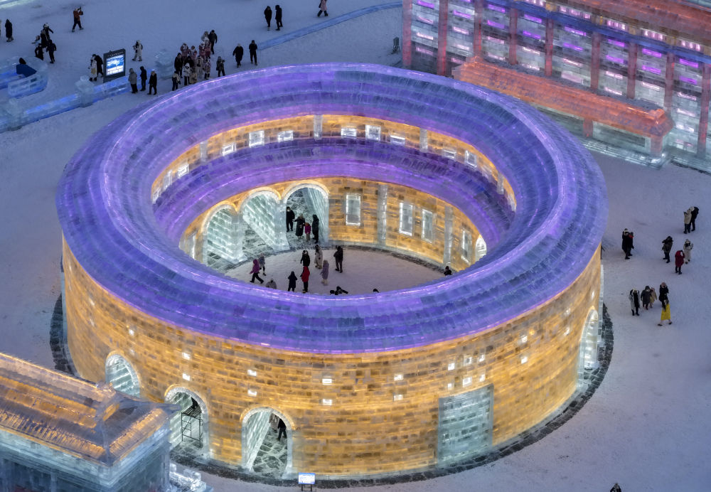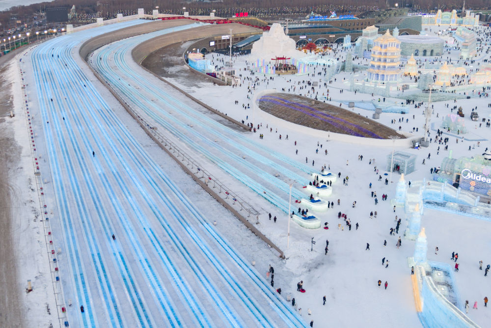 2025年12月17日,游客在哈尔滨冰雪大世界园区体验“超级冰滑梯”(无人机照片)。