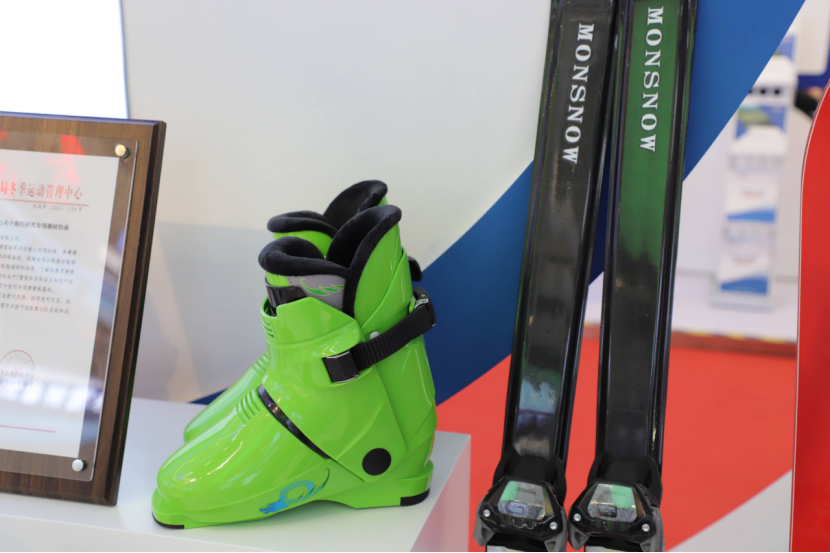 这是第三十四届哈洽会哈尔滨乾卯雪龙体育用品有限公司展位上展出的滑雪鞋、滑雪板装备(2025年5月18日摄)。