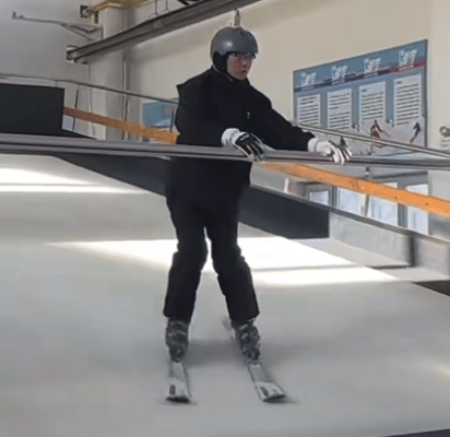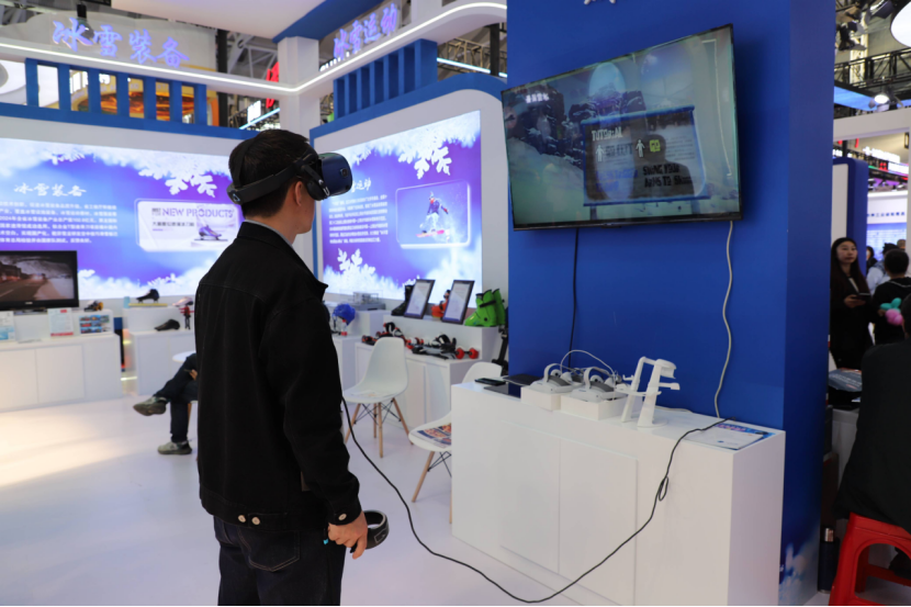 这是第三十四届哈洽会哈尔滨爱威尔科技有限公司设立的VR(虚拟现实技术)滑雪体验区,观众戴着VR眼镜体验滑雪乐趣(2025年5月18日摄)。