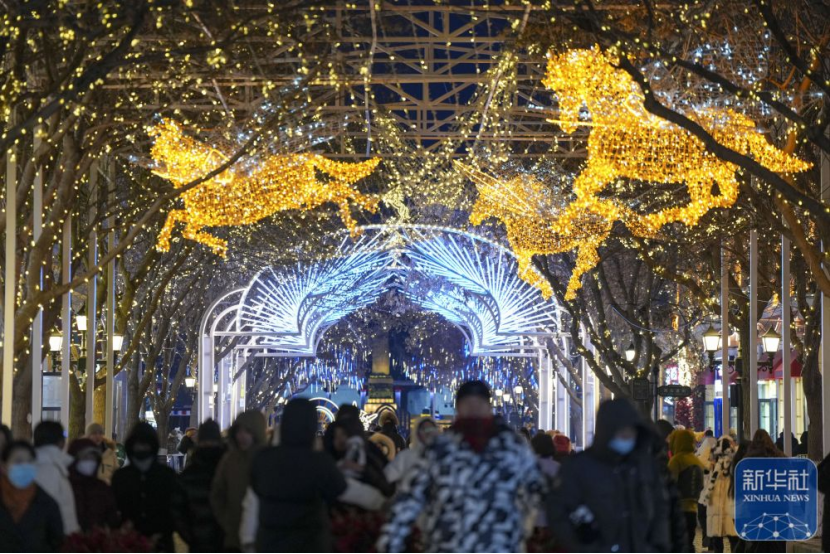 这是哈尔滨中央大街上以“冰雪迎宾 瑞马迎新”为主题的创意灯饰(2025年12月16日摄)。