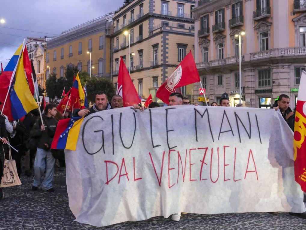 1月3日,在意大利那不勒斯,当地民众手持写有反对干涉委内瑞拉内容的标语参加抗议活动。