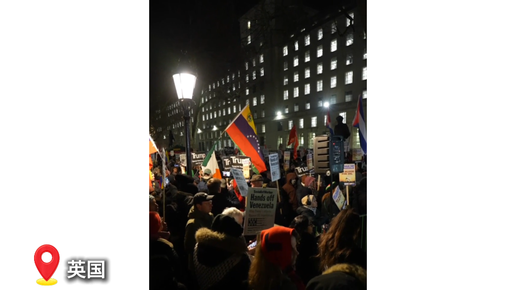 当地时间5日晚,大量民众聚集在英国首相官邸唐宁街10号,抗议美国对委内瑞拉的军事打击,要求英国首相斯塔默谴责美方行动。
