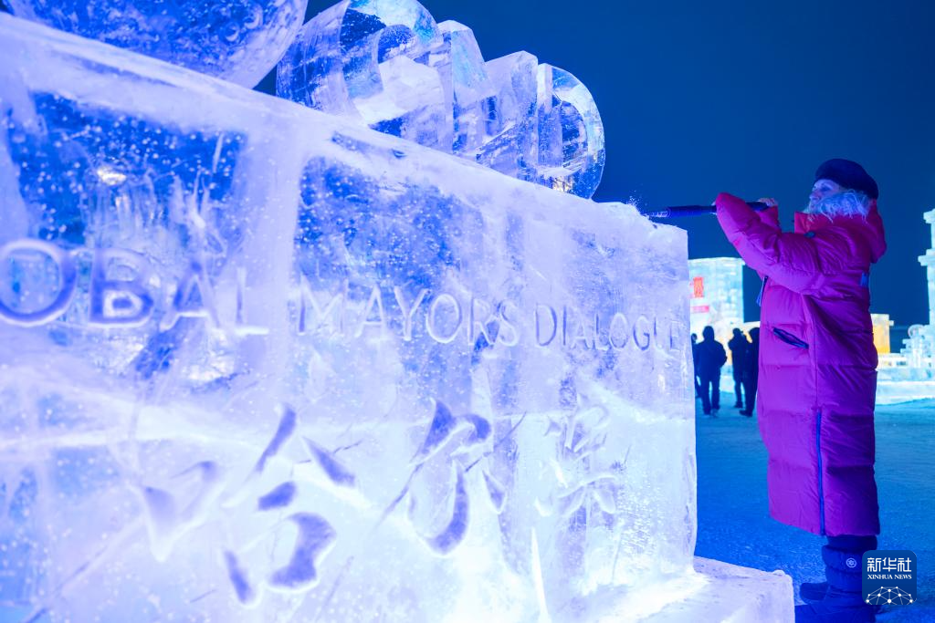 1月6日,嘉宾在“世界市长对话·哈尔滨”活动启幕仪式后体验雕刻冰雕。新华社记者 张涛 摄
