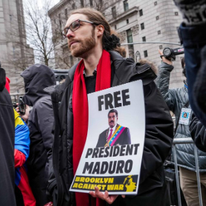 法院外,抗议者聚集,呼喊口号,要求释放马杜罗,抗议美国军事干涉委内瑞拉。一些人举着“释放马杜罗总统”“不要向委内瑞拉开战”“停止对委内瑞拉的非法战争”等标语横幅。