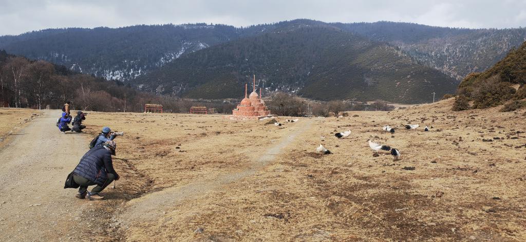 游客在普达措景区内拍摄藏马鸡。新华社记者浦超 摄