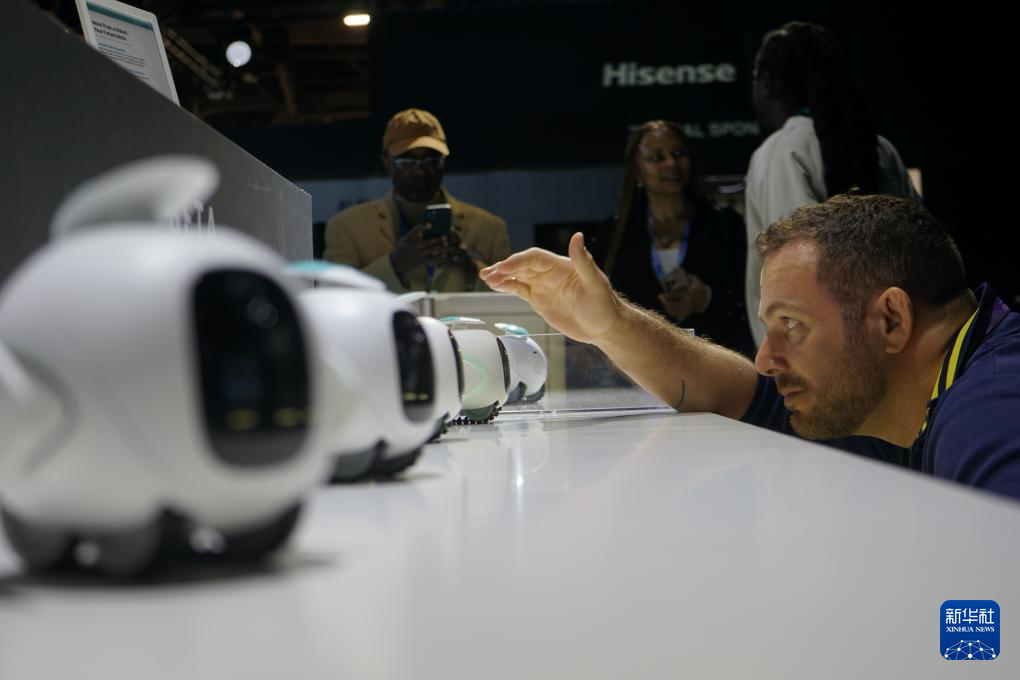 1月7日,一名男子在2026年美国拉斯维加斯消费电子展(CES)海信展台观看搭载新一代AI智能识别引擎的陪伴机器人Beta。 新华社发(曾慧摄)