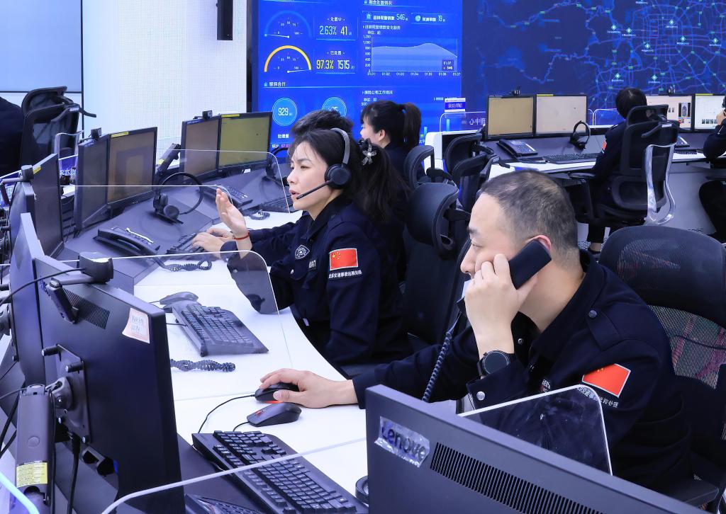 1月7日,在北京市道路交通事故警保合作远程处理中心,民警和远程处理专席人员、远程处理理赔专席人员在进行交通事故远程处理。新华社记者 邢广利 摄