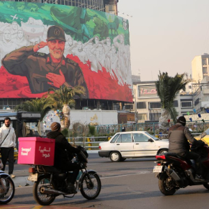 2026年1月6日,在伊朗首都德黑兰街头,车辆经过一幅绘有伊遇袭身亡的高级将领卡西姆·苏莱曼尼形象的宣传海报。新华社发