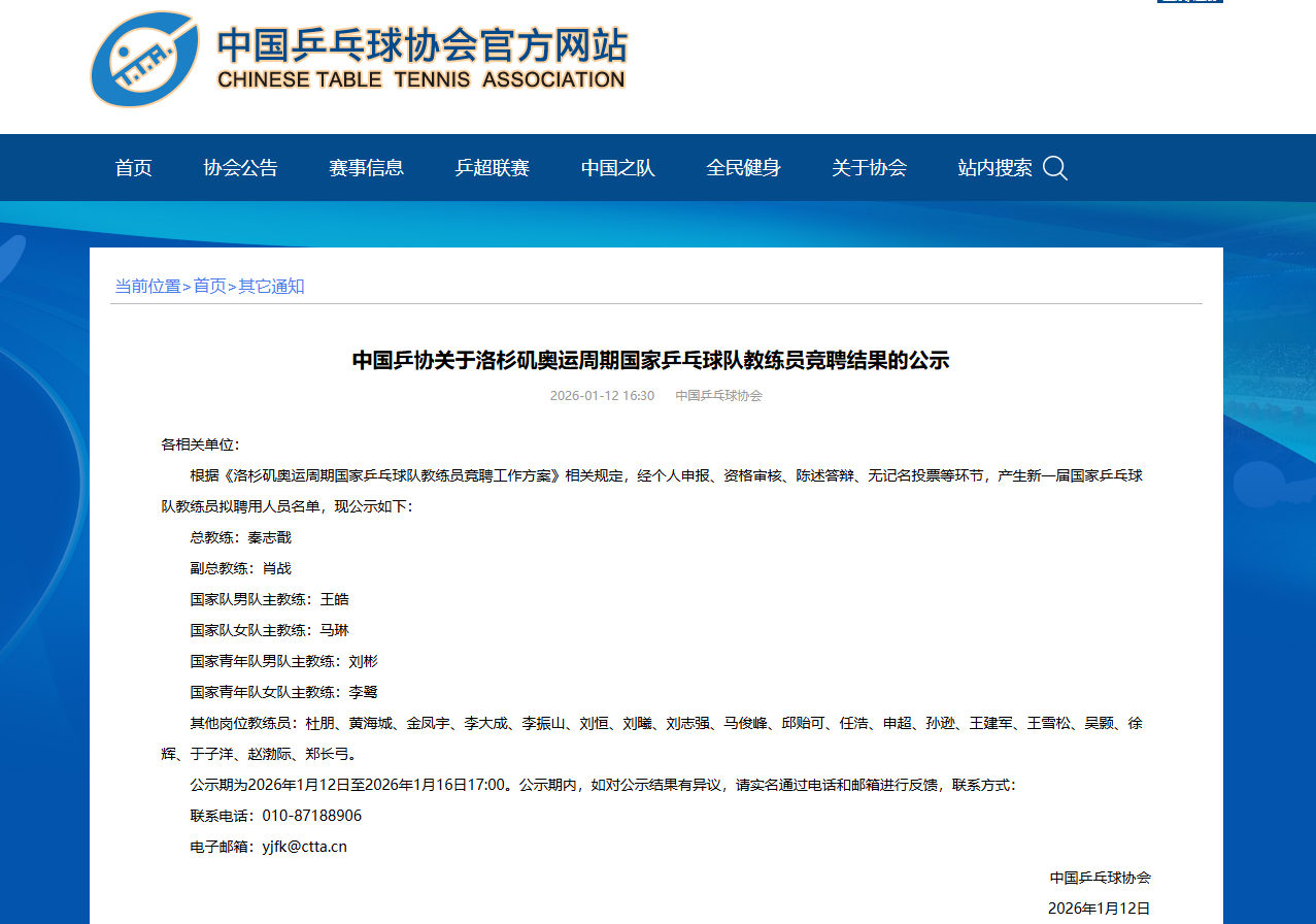 新华社北京1月12日电 中国乒协官网12日公示洛杉矶奥运周期国家乒乓球队教练员竞聘结果,拟聘秦志戬为总教练、肖战为副总教练。