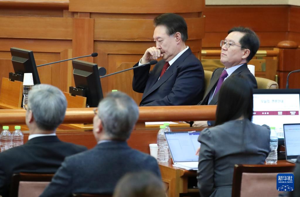 这是2025年2月20日尹锡悦(中)在韩国首尔宪法法院出席总统弹劾案庭审的资料照片。新华社记者 姚琪琳 摄