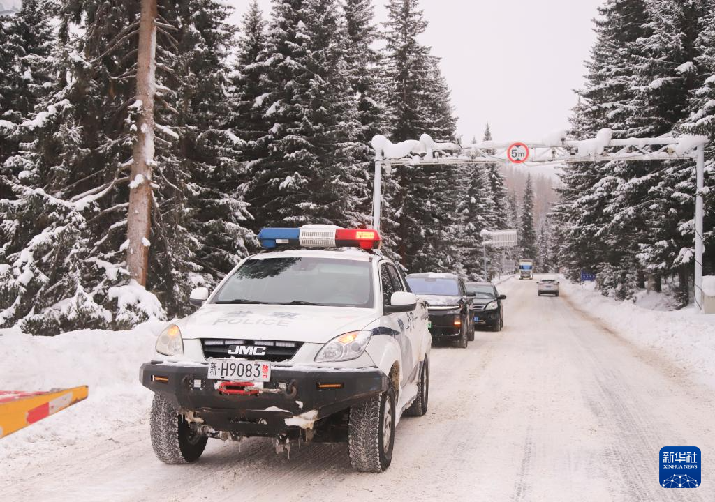1月13日,在新疆喀纳斯景区贾登峪服务区大森林路口,民警驾驶警车引导往来车辆安全行驶。新华社发(叶德力·热哈提 摄)