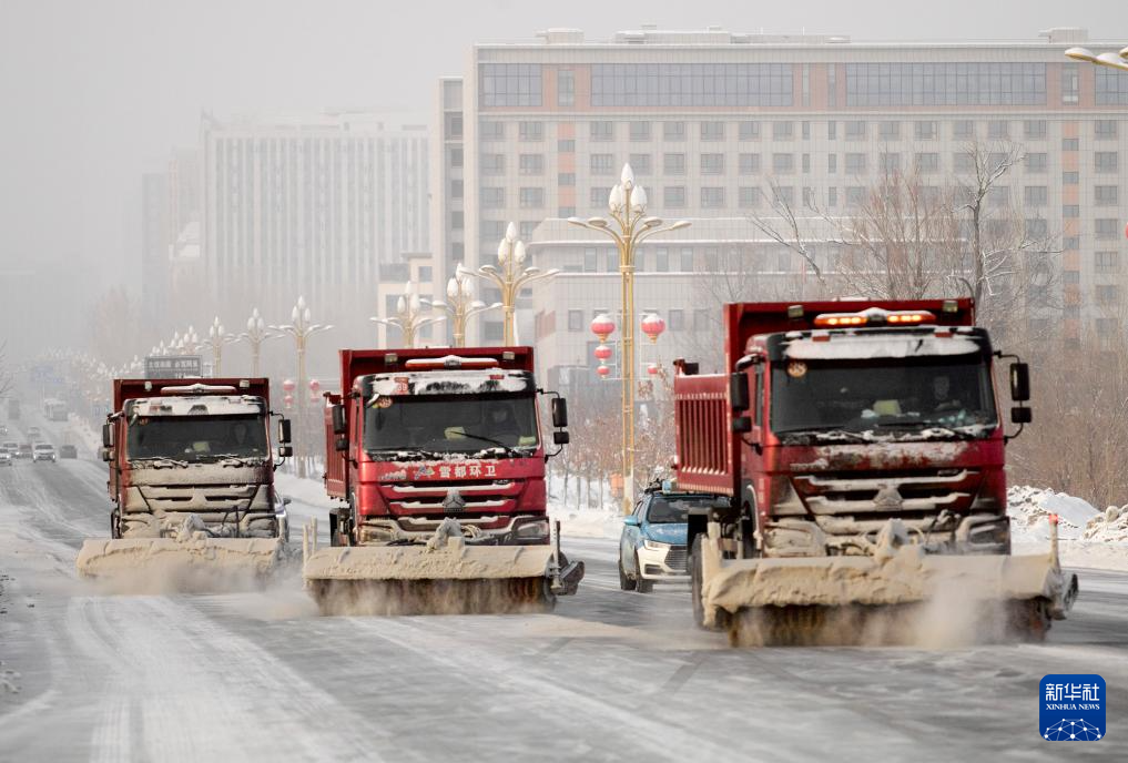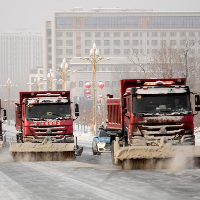 1月13日,清雪车辆在新疆阿勒泰市道路上除雪。新华社发(叶尔江·木哈买提 摄)
