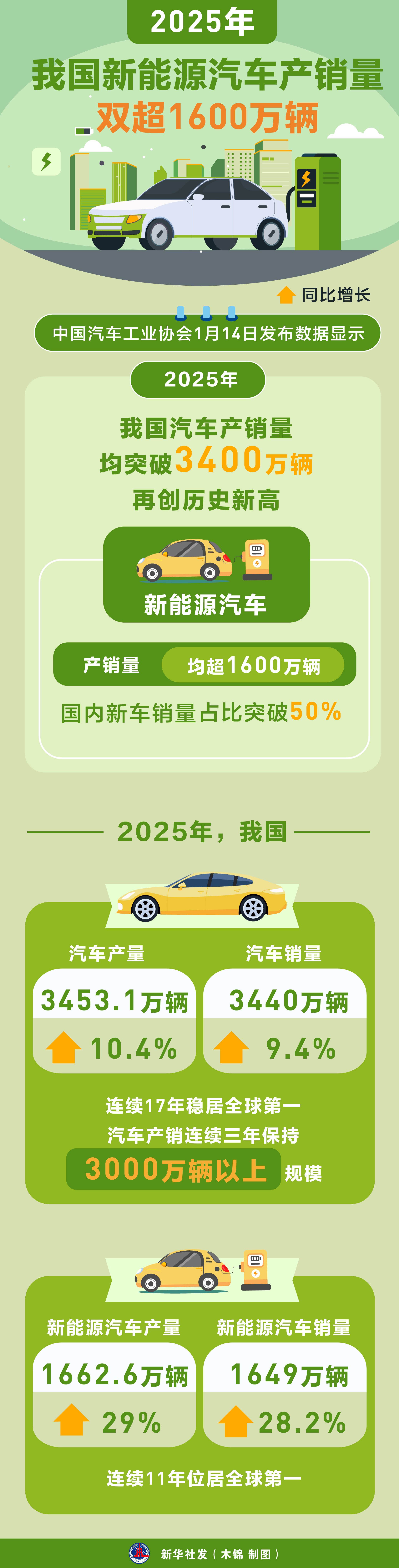 中国汽车工业协会1月14日发布数据显示,2025年,我国汽车产销量均突破3400万辆,再创历史新高。新能源汽车产销量均超1600万辆,新能源汽车国内新车销量占比突破50%。