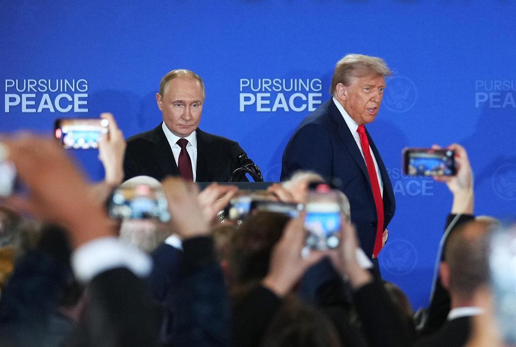 2025年8月15日,美国总统特朗普(后右)与俄罗斯总统普京(后左)在美国阿拉斯加州安克雷奇市埃尔门多夫-理查森联合军事基地举行会晤后共同出席联合记者会。新华社记者吴晓凌摄