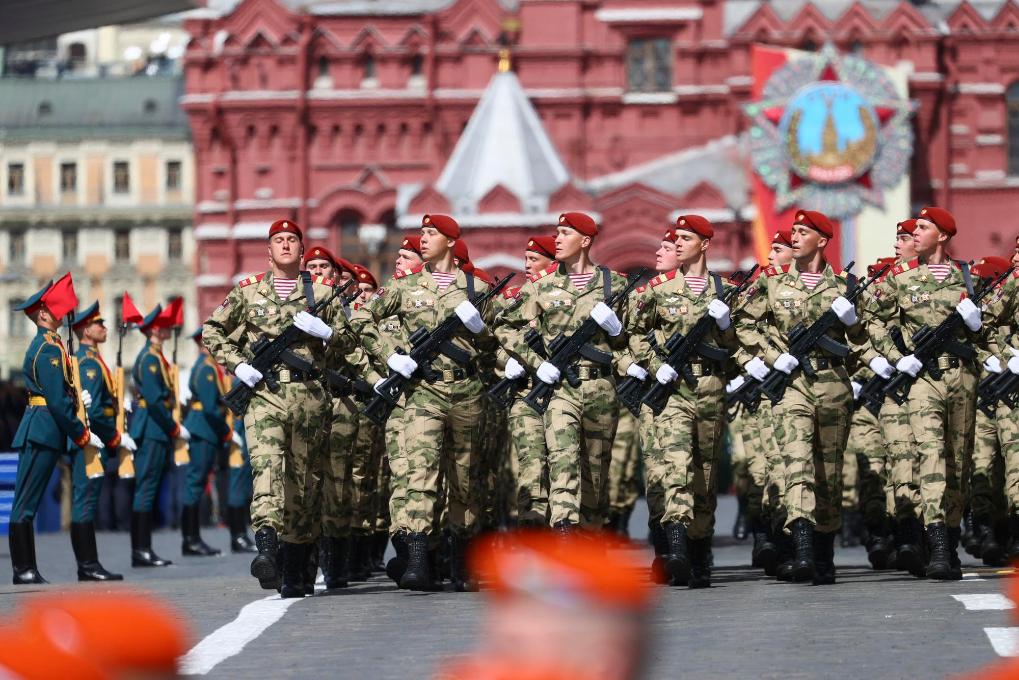 2025年5月9日,俄罗斯军人在首都莫斯科参加纪念苏联伟大卫国战争胜利80周年阅兵式。新华社记者白雪骐摄