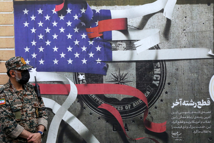 2025年11月4日,在伊朗首都德黑兰举行的集会上,安全人员站在反美宣传画前。当天,伊朗多地民众举行集会,谴责美国霸权和以色列的侵略行为。新华社发