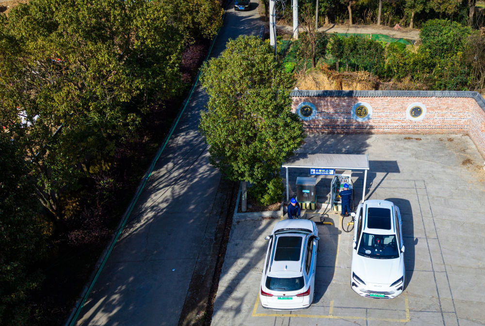 2026年1月11日,国网鄂州供电公司工作人员对鄂州市鄂城区西山街道小桥村充电站的充电设备进行巡检(无人机照片)。新华社记者 肖艺九 摄