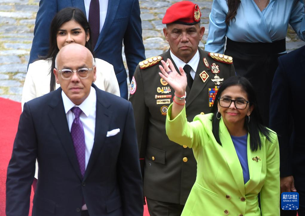 1月15日,在委内瑞拉首都加拉加斯,委内瑞拉代总统德尔西·罗德里格斯(前右)到达会场准备发表国情咨文。新华社发(马科斯·萨尔加多摄)