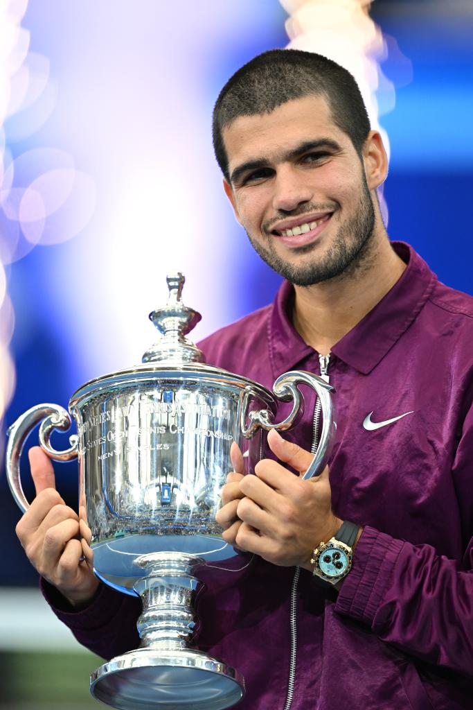 ↑2025年9月7日,冠军西班牙选手阿尔卡拉斯在2025美国网球公开赛男子单打颁奖仪式上。新华社记者 李睿 摄